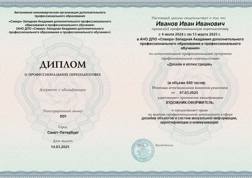 Каждый документ (диплом/удостоверение/свидетельство) соответствует п.2 ст.60 N-273 ФЗ, оформляется на русском языке, печатается на типографском бланке, защищённом от подделок. Ставится официальная печать образовательной организации. С образцами документов можно ознакомиться на сайте в разделе «Лицензия и документы».