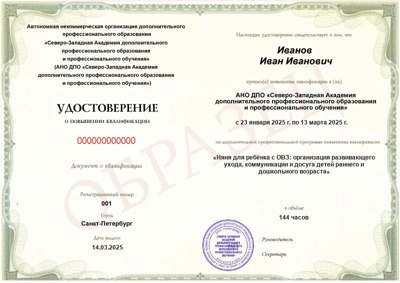 Курс повышения квалификации Няня для ребёнка с ОВЗ: организация развивающего ухода, коммуникации и досуга детей раннего и дошкольного возраста (144ч)