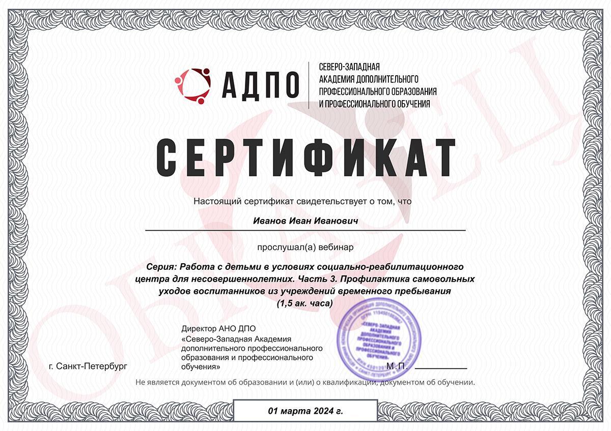 Каждый документ (диплом/удостоверение/свидетельство) соответствует п.2 ст.60 N-273 ФЗ, оформляется на русском языке, печатается на типографском бланке, защищённом от подделок. Ставится официальная печать образовательной организации. С образцами документов можно ознакомиться на сайте в разделе «Лицензия и документы».